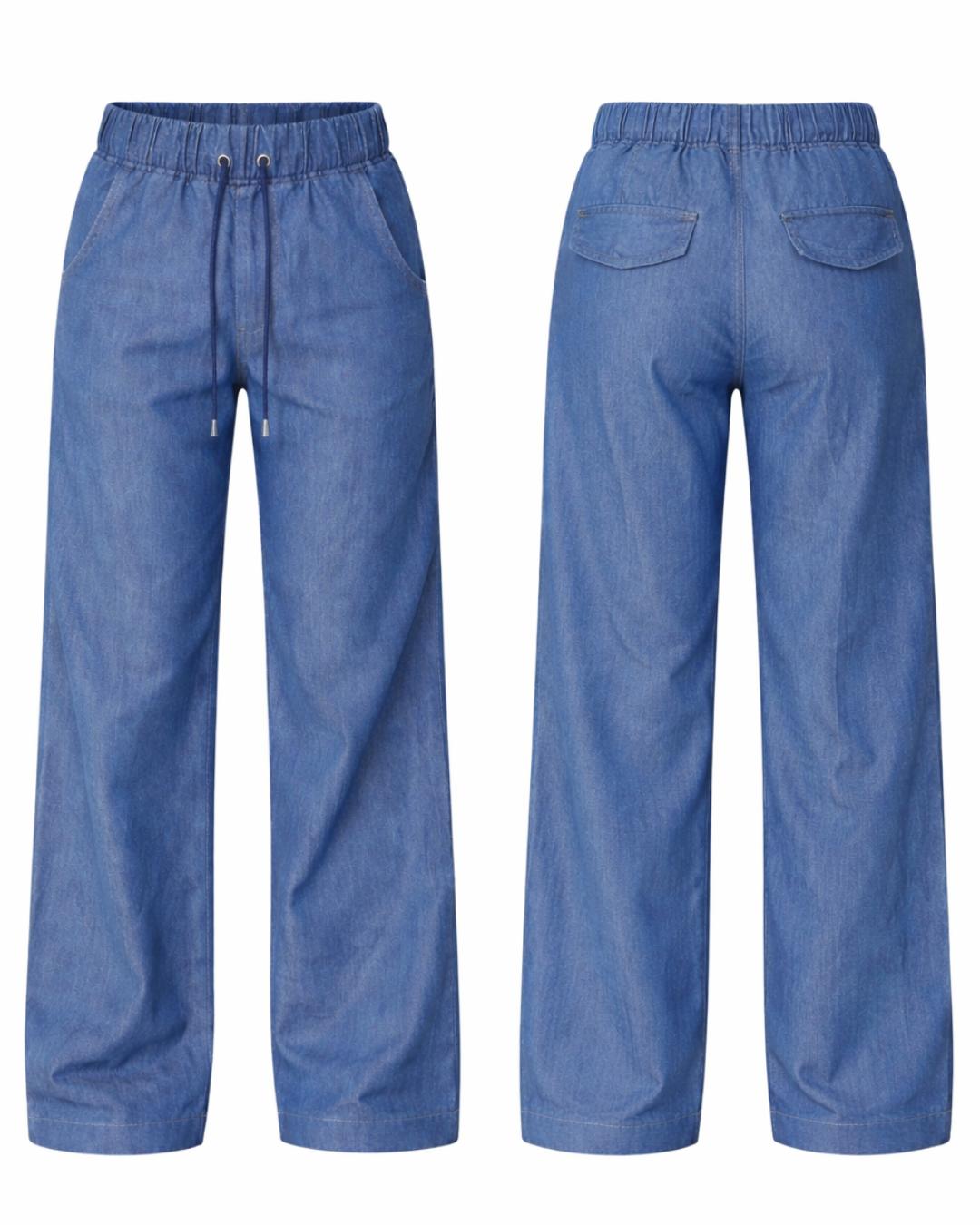 Cuenta con una pretina elástica de tiro alto que se adapta suavemente a tu cintura, complementada con un cordón ajustable para un talle personalizado. Confeccionados en un chambray de algodón ultrasuave que imita la apariencia del denim pero con una ligereza excepcional, ideal para climas cálidos o días largos. Incluye bolsillos delanteros integrados de forma sutil para mantener una línea limpia y estilizada.